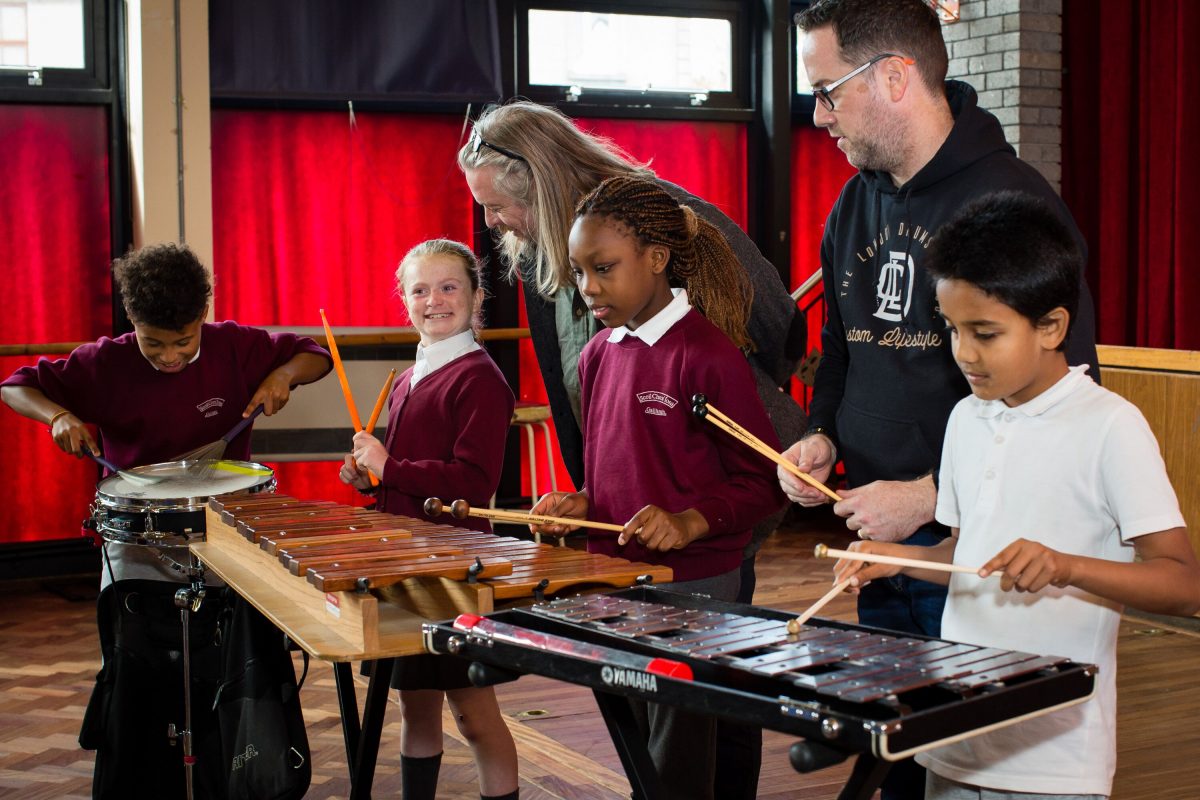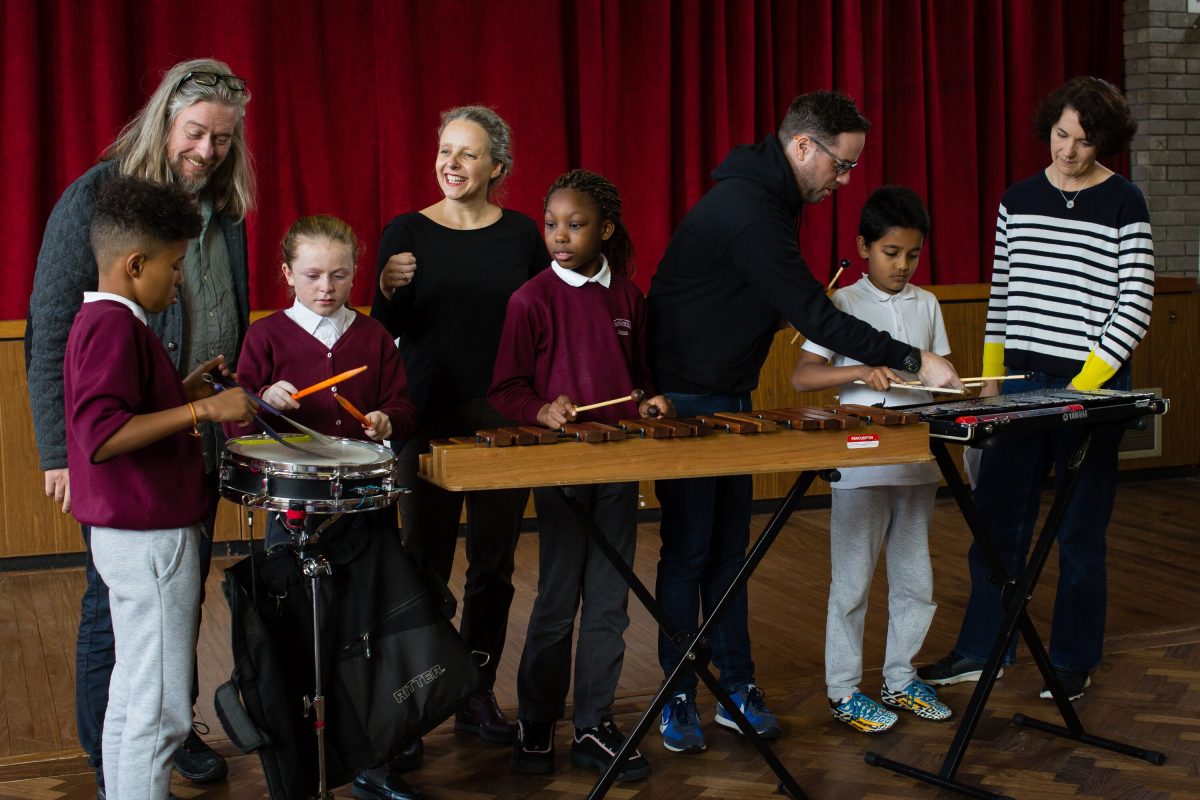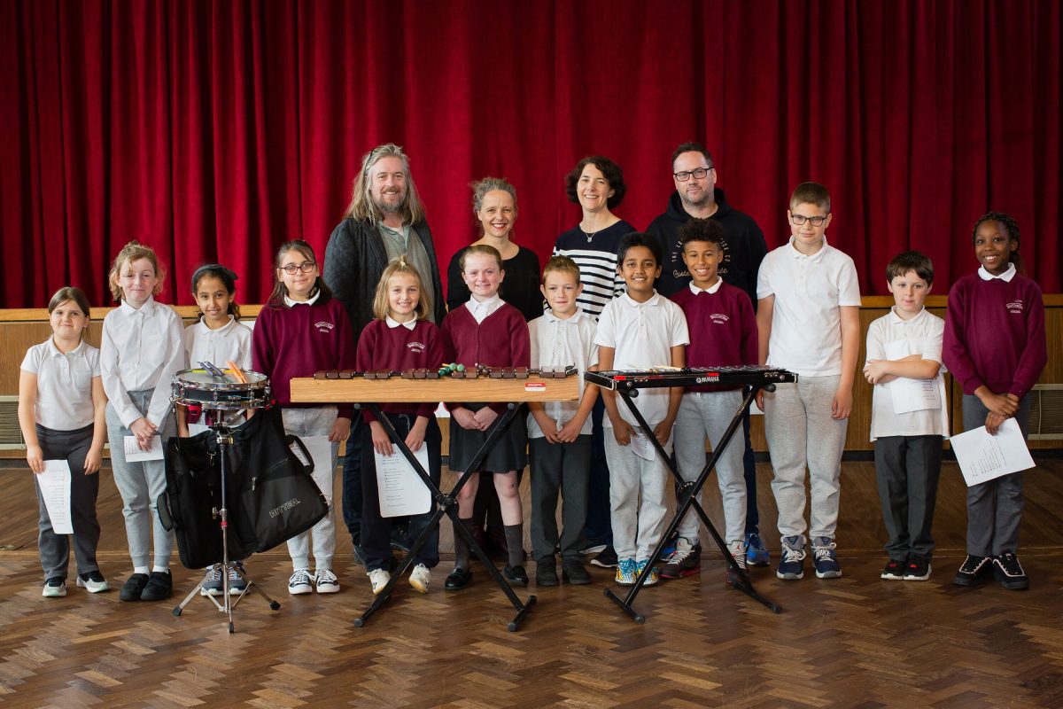 PICTURED – Hugh Kelly (Adventures in Music and MCnG), Anna Lardi Fogarty (Executive director of Music for Galway), Aislinn Ó hEocha (Executive Artistic Director of Baboró), Terry Cooke (Percussionist) and some children of Scoil Iosa Chroi. Photos: Sinead McPhillips